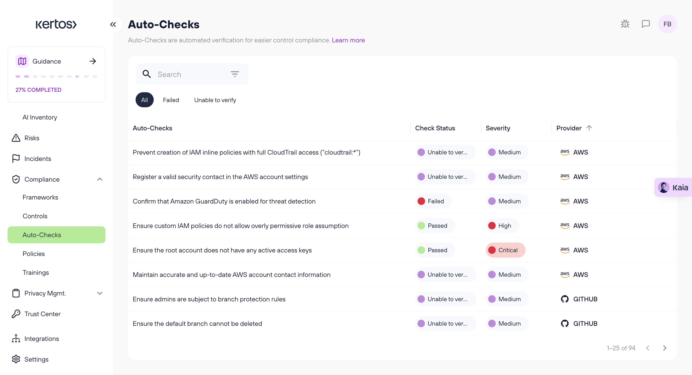This feature provides visibility into key areas like access management, change control, and secure development, transforming manual, time-consuming verification into an automated and structured process within Kertos.