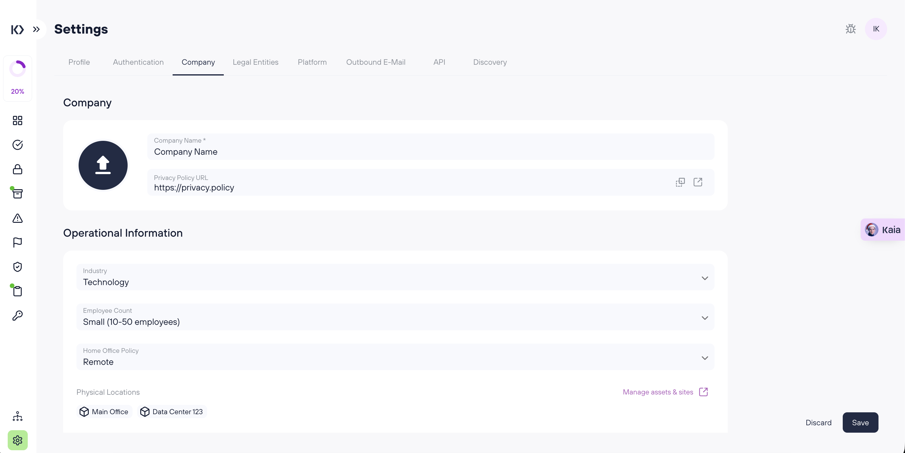 The Company tab contains organization-level information that helps Kertos reflect your company context and operational setup.