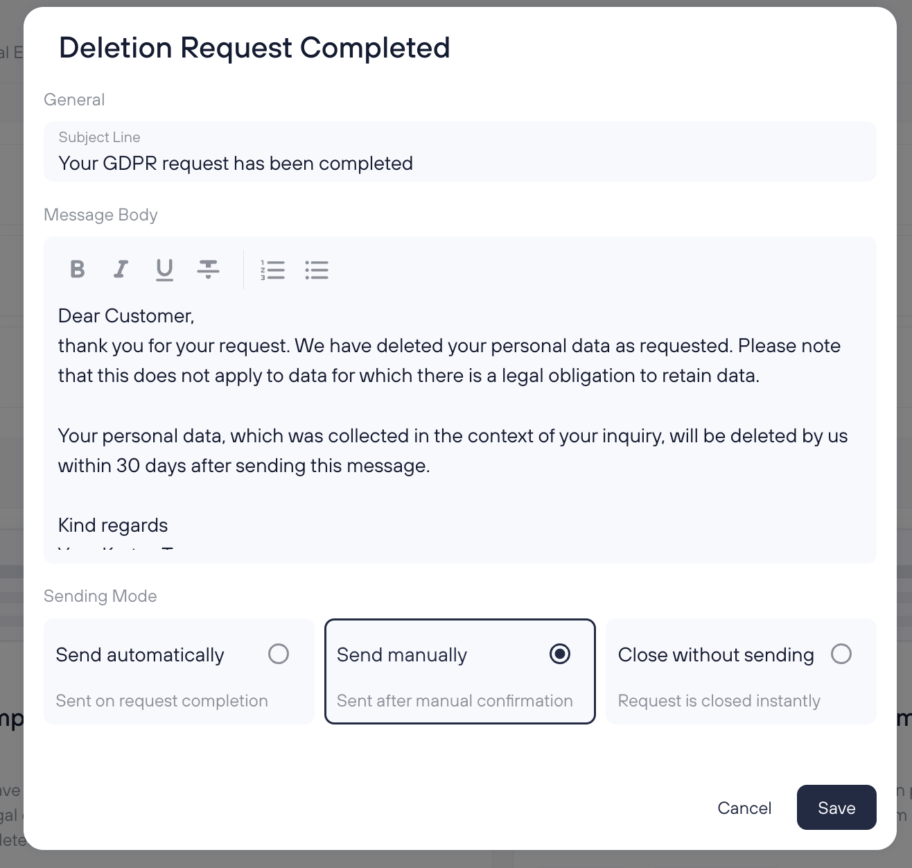 When you open a template (e.g., Deletion Request Completed), you can configure: