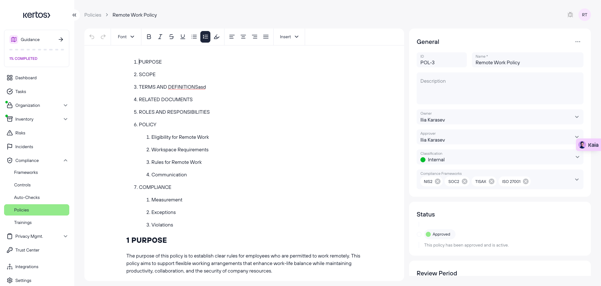 Policy creation and maintenance can be time-consuming and complex, especially when dealing with legal and regulatory language. Kertos addresses these challenges by providing guided, flexible options for creating compliant policies and assigning them to the right users at the right time.