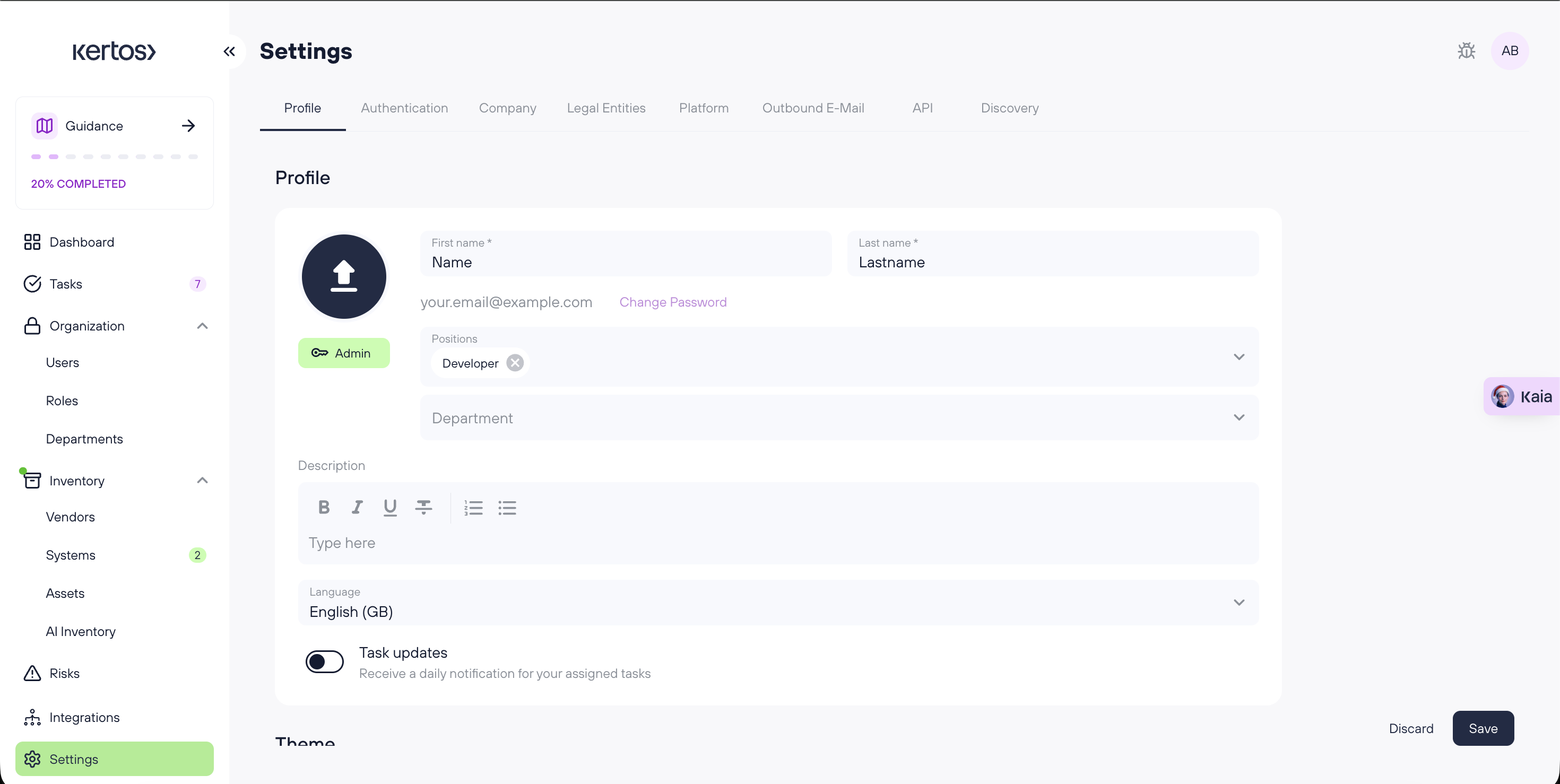 The Profile tab contains your account information and personalization settings. Changes here affect how your account appears and how Kertos behaves for you (for example, platform language, daily task emails, and theme).